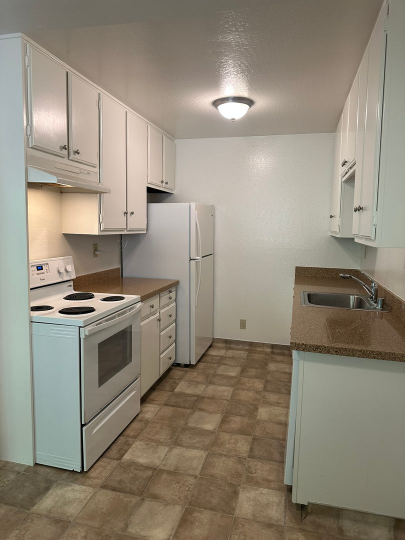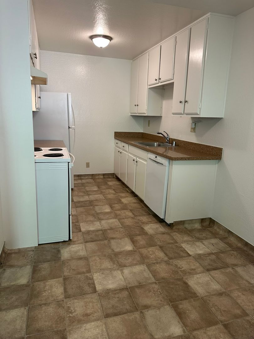 - Kitchen with granite counters, electric range, refrigerator and dishwasher.